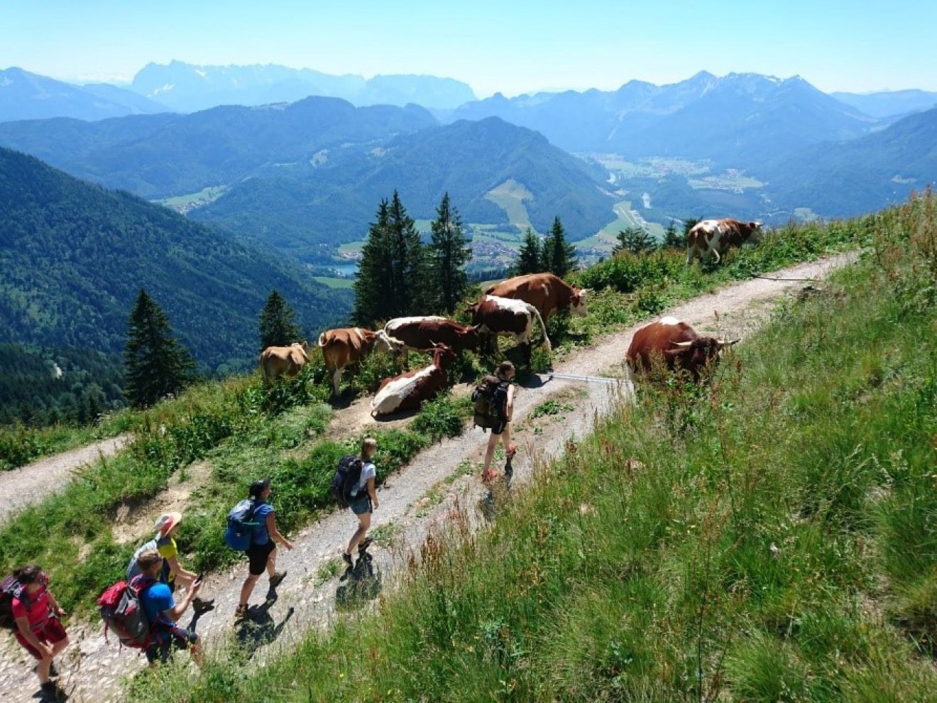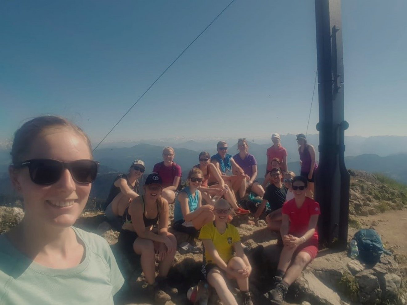 Am nächsten Morgen ging es dann ins Chiemgau nach Marquartstein, genauer gesagt an den Hochgern, wo es vorerst die Unterkunft zu erreichen galt. Trotz den sonnigen Temperaturen von über 30 °C ging es dank dem im Wald gelegenen schattigen Weg recht flott den Berg hoch, sodass die im Tal angeschriebene Aufstiegszeit zur Hütte trotz wichtiger Verschnaufpausen und einer Brotzeit kaum überschritten und die Unterkunft bezogen werden konnte: Übernachtet wurde im Hochgernhaus, wo wir auf 1550m am Hang mit Blick auf die österreichischen Alpen die Aussicht genießen konnten. Für die besonders motivierten Wanderer ging es aber nach kleiner Erfrischung in der Stube wieder aufwärts – der Gipfel dieses Bergs liegt nämlich auf ca. 1750m. Doch auch das letzte Stück konnte noch erklommen werden, inklusive Spitzenaussicht über den Chiemsee und die Alpen, sowie Gruppenbild am Gipfelkreuz und Eintrag ins Gipfelbuch. Nach dem Abstieg zum Hochgernhaus ließ man es sich dann wieder als vervollständigte Wandergruppe bei Gegrilltem und Kaiserschmarrn gutgehen und konnte den Sonnenuntergang am Lagerfeuer genießen.