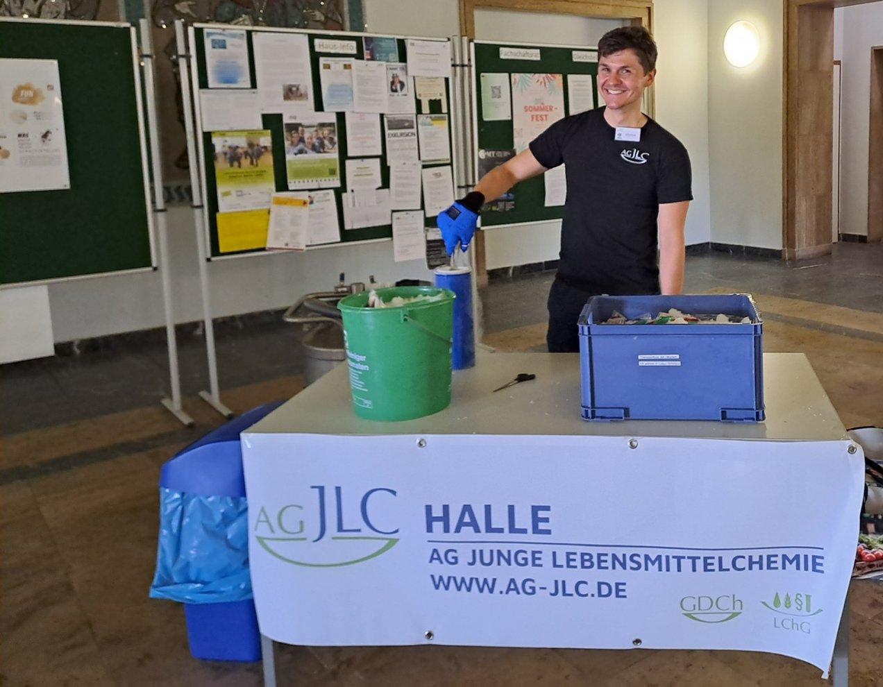Die AG JLC Halle hat an ihren Stand im Foyer unseres Chemie-Instituts die Kenntnisse der über 300 Besucher:innen über die Zutaten ihrer alltäglichen Lebensmittel auf die Probe gestellt und Papierchromatographie - eines der Experimente unserer Postkartenreihe - angeboten. Unser Learning dabei: manchmal sollte man nicht so wissenschaftlich an etwas herangehen, da die Filterpapiere der Kleinsten am schönsten aussahen. Besonders interessant dabei war es, für alle zu sehen, aus wie vielen Farben Schwarz und Braun tatsächlich zusammengesetzt sind.