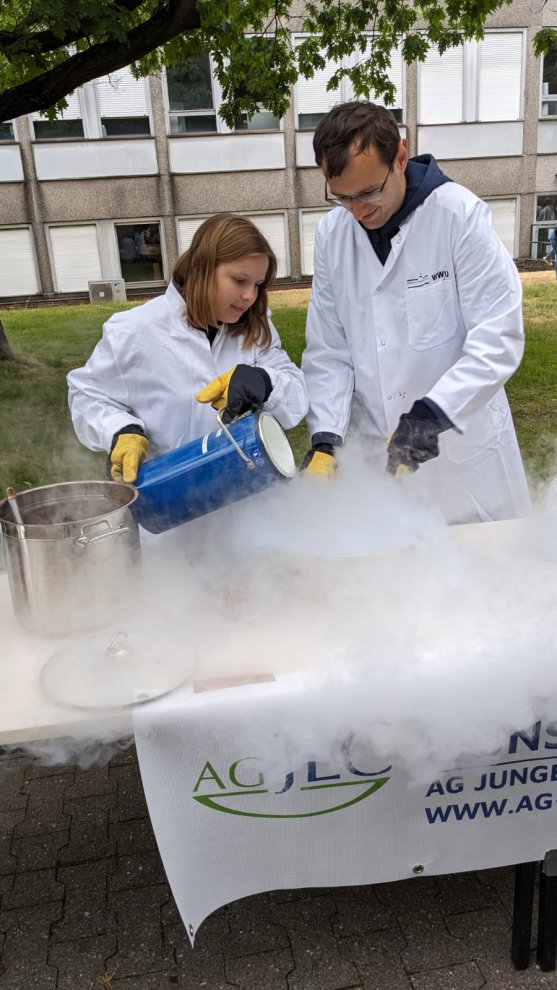 Am 28.06.2023 haben wir von der AG Münster zusammen mit der Fachschaft Chemie, dem JCF und weiteren studentischen Gruppen der chemischen Studiengänge das Sommerfest der Chemie nach langer Zeit wieder stattfinden lassen. Auf dem Programm stand zunächst ein spannender Vortrag samt lebhafter Diskussionsrunde von Dr. Dieter Kunz zum Thema „Plastikmüll- Wissen und Spekulation“. Aus lebensmittelchemischer Sicht war am Vortrag besonders interessant, dass sich Plastik in Form von Mikroplastik hauptsächlich in Innereien ansammelt, die eher selten verspeist werde Außerdem verlässt Mikroplastik den Verdauungsstrakt kaum in den Körper. Dadurch ist Plastik für unsere Ernährung eher unproblematisch einzuschätzen. Im Nachgang an den Vortrag haben wir unser bei diversen vorherigen Veranstaltungen stets beliebtes Schokoeis serviert, allerdings erstmals in einer veganen Variante, was bei den zahlreichen Gästen neben dem guten Geschmack des Eises auch durch die spektakuläre Herstellung mit flüssigem Stickstoff für Begeisterung gesorgt hat. Nebenbei haben wir einige unserer AG-Flyer und Postkarten verteilt und in Gesprächen mit den wartenden Gästen (hoffentlich erfolgreich) Werbung für die AG gemacht.