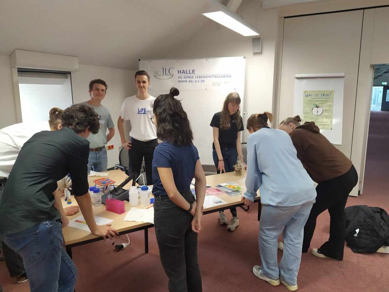 Am Stand der AG JLC Halle haben wir erklärt, was Lebensmittelchemie überhaupt ist und was wir in unserem Studium lernen. Die Schüler:innen konnten ihre Kenntnisse zu Lebensmittelinhaltsstoffen testen und bekannte Lebensmittel ihren Inhaltsstofflisten zuordnen oder nach einer kurzen Einführung mit einem pH-Meter Verschiedenes aus dem Alltag selber vermessen. Was ist saurer, Früchtetee oder Cola? Und wie unterscheidet sich der pH-Wert von Waschmittel zu Shampoo? Diese und viele weitere Fragen wurden an unserem Stand beantwortet.